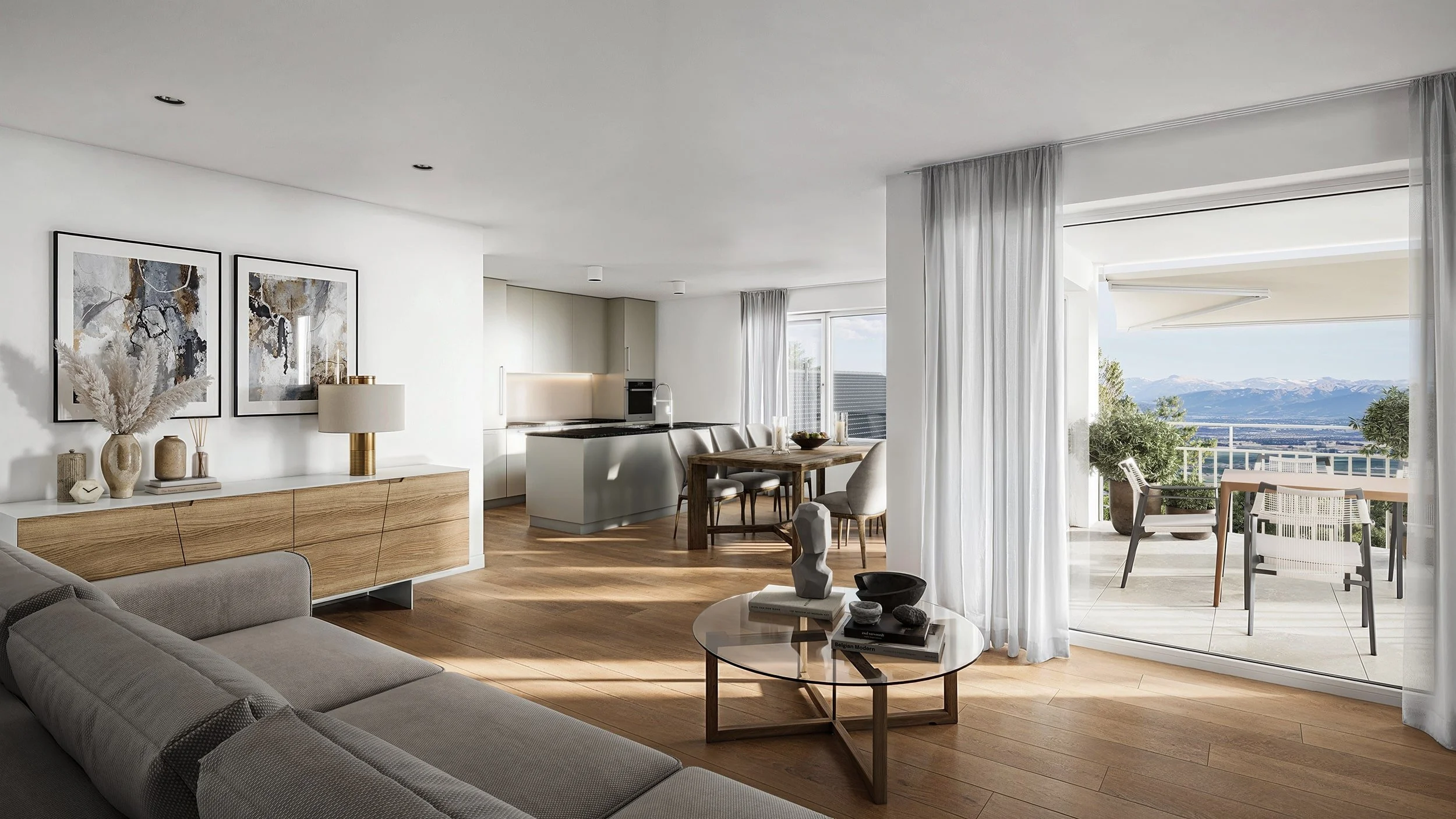 Modern living room with beige sofa, wooden sideboard, abstract artwork, round coffee table with sculptures, open kitchen, dining area, sliding glass door leading to balcony with outdoor furniture and mountain view.