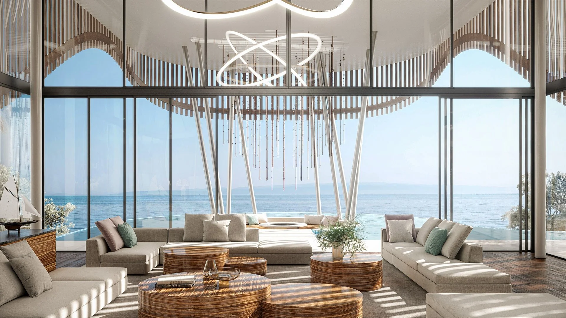 Modern living room with large glass windows overlooking the ocean, featuring beige sofas, wooden coffee tables, and a contemporary chandelier.