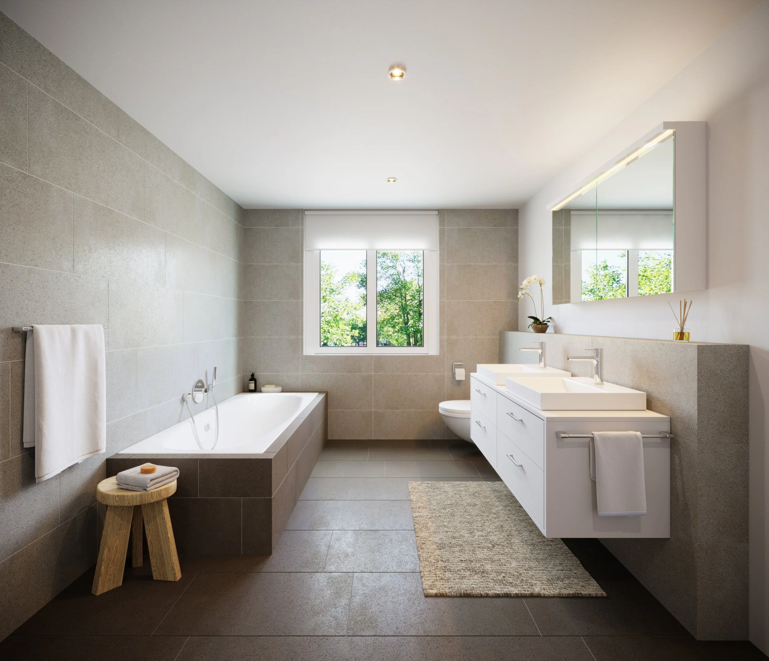 3d visualization of Modern bathroom with a bathtub, double vanity sinks, large mirror, window with greenery outside, and neutral-toned tiles. View fullsize